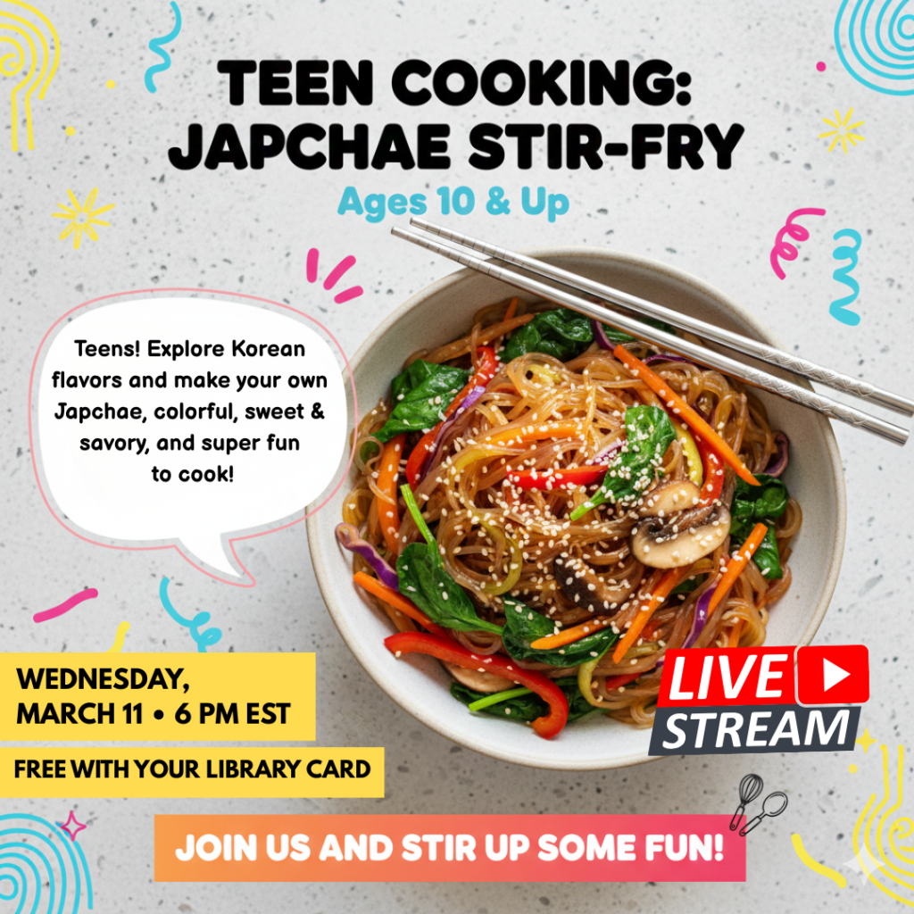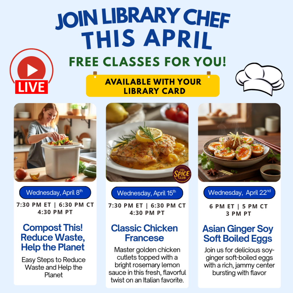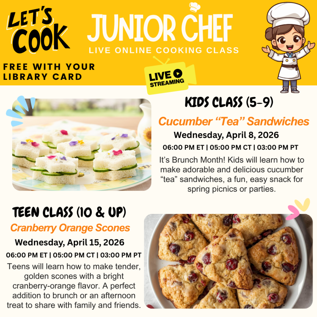 We’re excited to offer you access to Library Chef—your go-to platform for fun cooking experiences for adults, kids, and teens! With your library card, you can dive into live cooking classes, exciting recipes, and more.